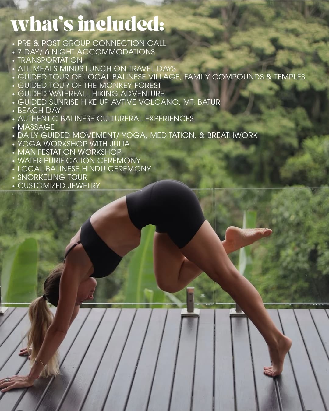 Join Julia Pindar & the Beach Town crew in Bali! A trip of a lifetime including yoga, halloween opening circle, guided tour of local balinese village, tour of monkey forest, waterfall hiking, active volcano hike, waterfall purification ceremony, & massage.