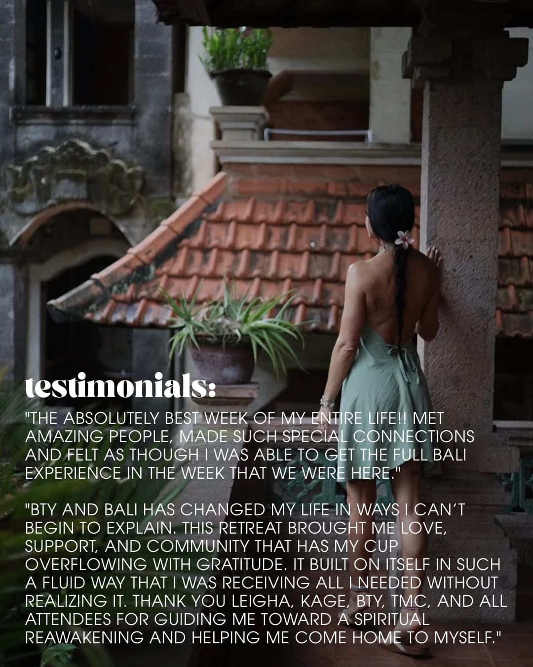 "BTY and Bali has changed my life in ways I can’t begin to explain. This retreat brought me love, support, and community that has my cup overflowing with gratitude. It built on itself in such a fluid way that I was receiving all I needed without realizing it. Thank you Leigha, Kage, BTY, TMC, and all attendees for guiding me toward a spiritual reawakening and helping me come home to myself."